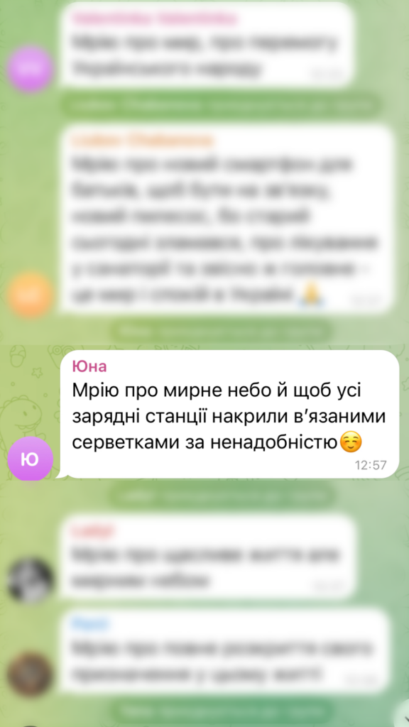 Серед сотень повідомлень про плани та мрії, коментар Юни став справжнім хітом чату. Вона написала: «Мрію про мирне небо й щоб усі зарядні станції накрили в’язаними серветками за ненадобністю». Ця фраза настільки відгукнулася кожному з нас, що вибір переможця став очевидним.
